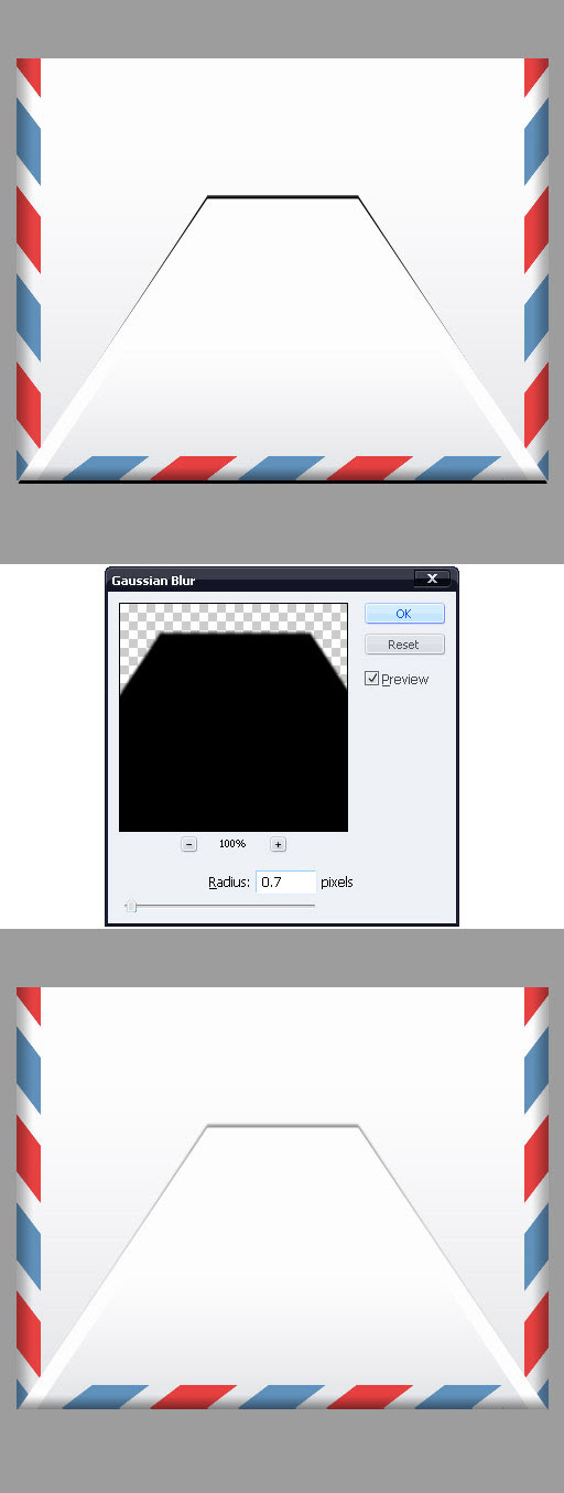 Create a new layer and place it under the “lower” layer in the layers palette. Command-click on the “lower” layer and fill the selection with black on the new layer. Press Command + T and increase its height to 102%. Now go to Filter > Blur > Gaussian Blur, type 0.7px and click OK. Reduce its Opacity to 40% and clear out its portion that flows outside the envelope’s body.
